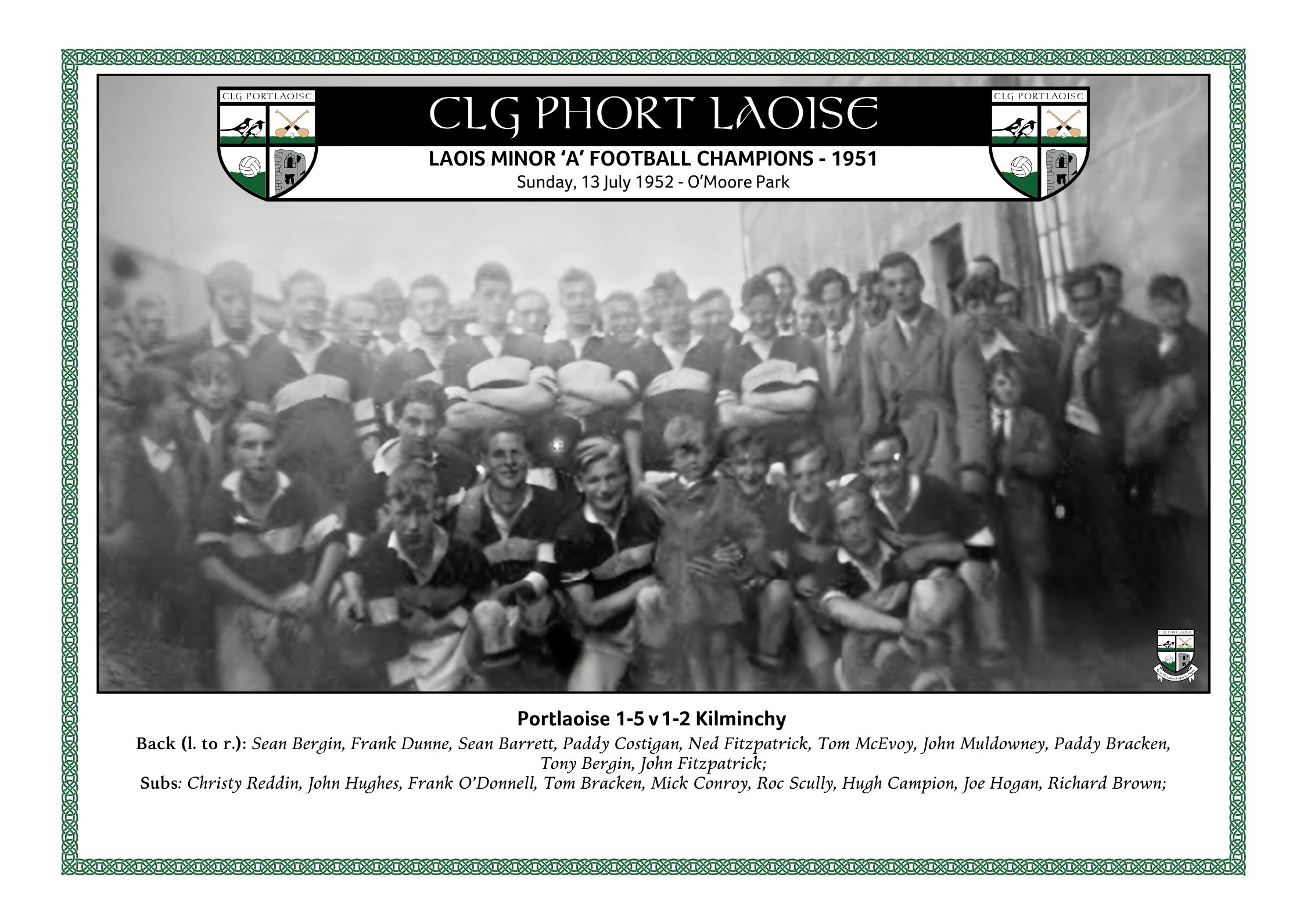 Rocky Scully, Paddy Costigan, Tom Bracken, Tony Bergin, John Hughes, John Muldowney, Frank O’Donnell, Paddy Bracken, Richard Browne, John Hogan, Christy Reddin, Mick Conroy, Hugh Campion, Ned Fitzpatrick, Sean Bergin
